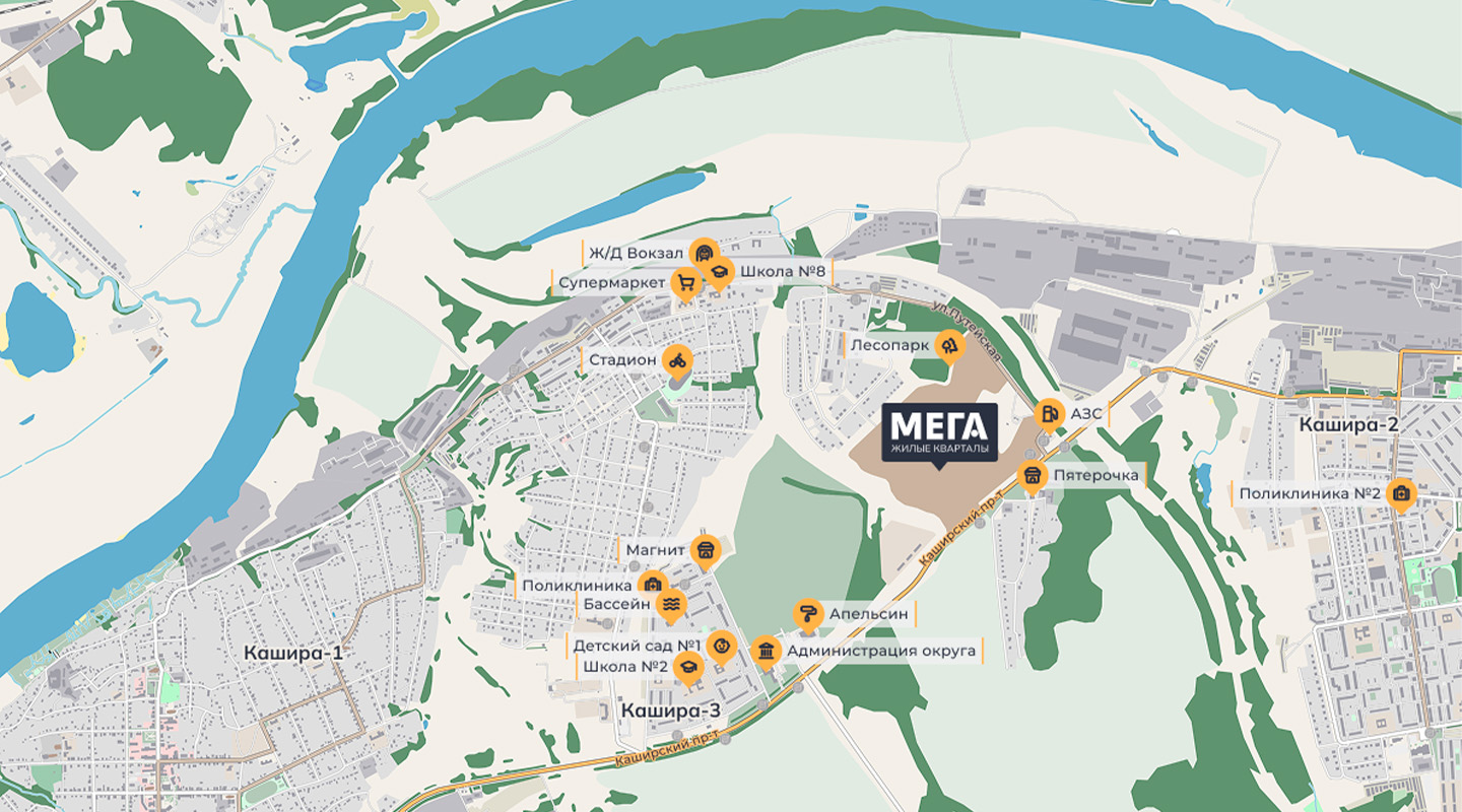 Новый городской квартал «Мега» расположен в центре Каширы в окружении лесопарков, имеет хорошую транспортную доступность с выездами на основные городские магистрали.